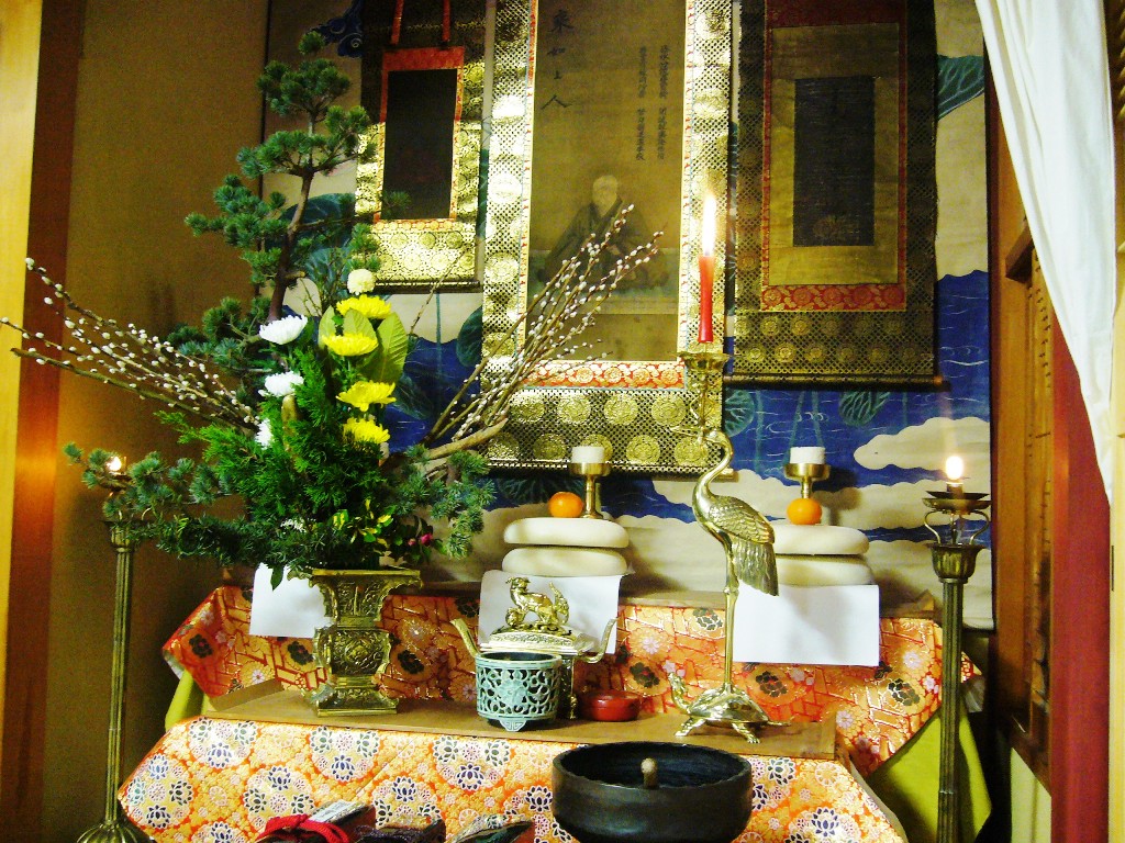 毎年十二月二十六日から翌一月八日まで、二幅の御影を双懸(そうけん)して「御越年(ごおつねん)法要」が営まれ、参詣された各組の代表者がここで供えられたお鏡(二十四枚)を分けて頂いて帰り、これに餅米をつき混ぜ「鏡割り法要」を厳修し、この御座にお参りした各集落の世話方は、頂いたお鏡に更に餅米をつき混ぜて必要な量のお鏡やお華来を作り、集落毎の「御巡化(ごじゅんけ)法要」をお勤めしてお供えを各戸に配られる仕組みになっています。