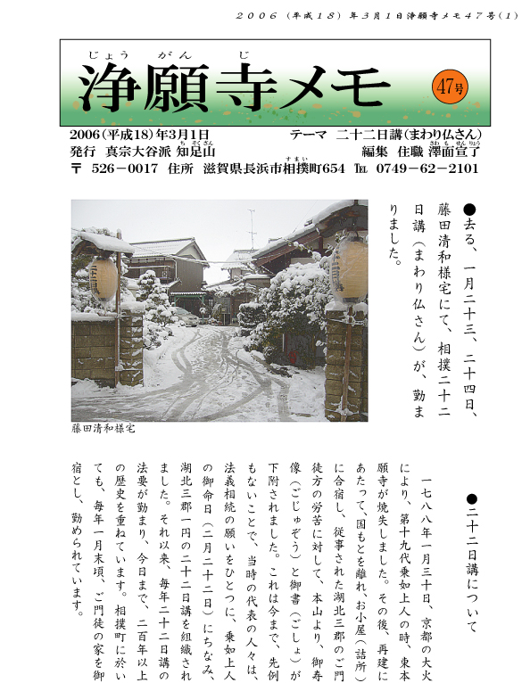 こうして、湖北二市二郡全ての御門徒が二十二日講の御縁にお遇いすることが出来るようになっています。今日、私たちはこの勝縁に遇い、乗如上人の御苦労、我がご先祖のご苦労と喜びの姿を偲びつつ、更に二百有余年連綿と伝えられてきた法悦の歴史を感じて、掌を合わす我が身の誇りと幸せを噛みしめたいものであります。