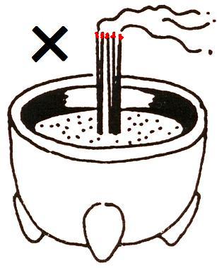 ▼真宗の作法では、線香は立てません。線香は、もともと荒びき状の抹香(まっこう)では持ちが悪く、芳香(ほうこう)が長く保ちにくいので、江戸時代になってから考えられたものです。そのために、たとえ線香を用いたとしても、正式な作法に近いように、線香を香炉(こうろ)の大きさに合わせて2、3本に折り、火をつけて横に寝かせます。あくまでも火種としての代用品です。