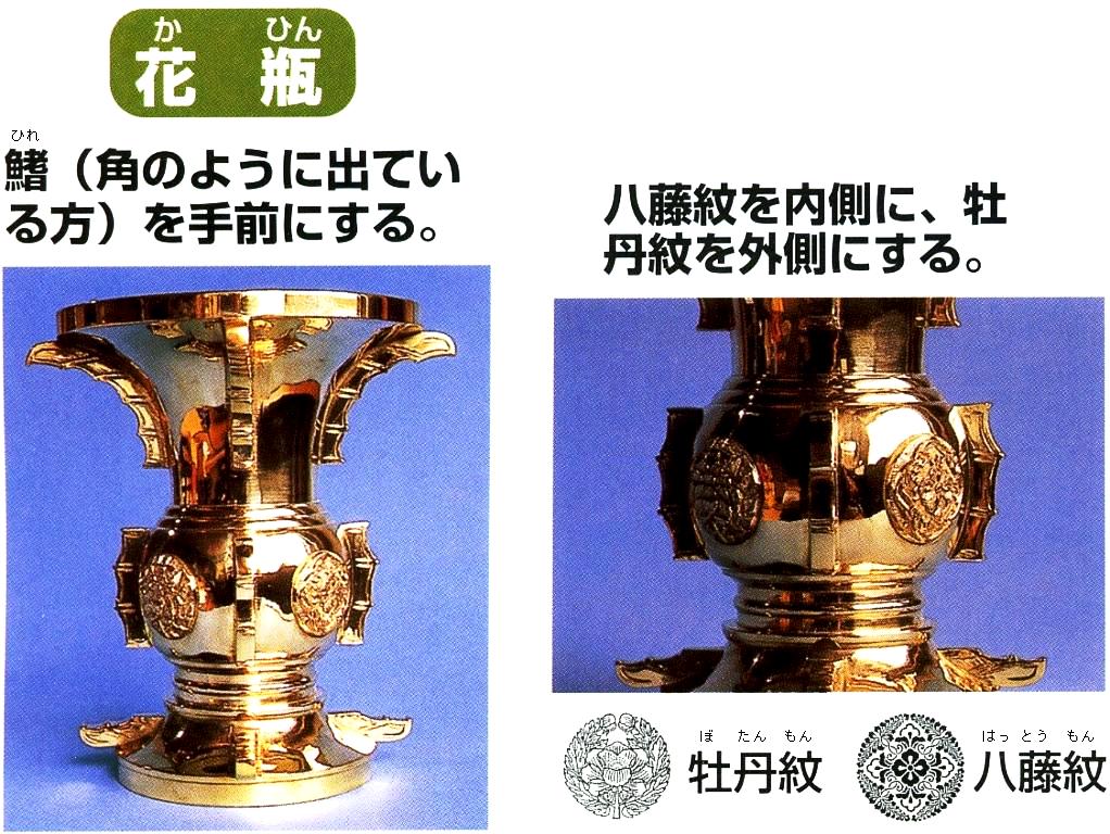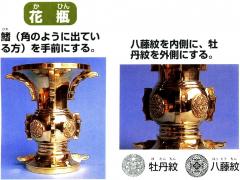 ▲五具足の時は、左右、逆になりますので、左右ではなく、八藤紋は内、牡丹紋は外と覚えます。