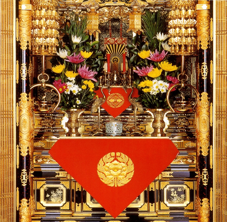 ▲枕勤め(まくらづとめ)から、通夜、葬儀までの荘厳は、原則として平常のままです。還骨勤行(かんこつごんぎょう)からの荘厳です。