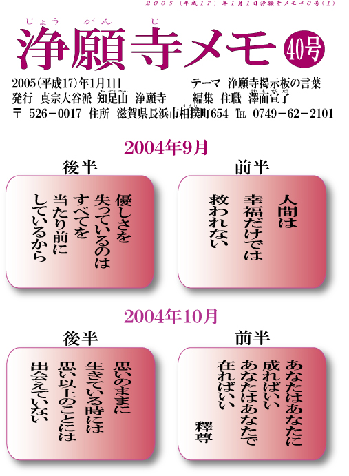 ●40号では、2004年9月〜12月までの浄願寺掲示板の言葉を掲載しました。