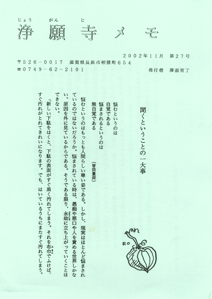「ああ、下駄の汚れの原因は自分の足の裏が汚れていたからだなあ」と気づかされたときに、いのちに体温が通う。その時に、悩まされる世界から悩む世界に転ずるのであろう。悩みがなくなるのでも、解決するのでもない。真に主体的に悩んでいける自分が誕生する。つまり、限りなく問うべき課題が生まれてくるということだ。信仰とはそういう歩みをたまわることである。だが、それは、人間の知恵や眼からは毛頭見つかってこない。そこに教えを聞くということの一大事がある。満ち足りた現実社会の中で、人間が忘れている一大事である。