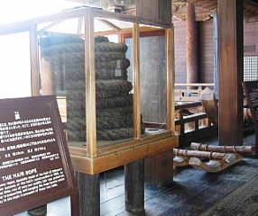 世界最大級の木造建築物とされる御影堂、及び阿弥陀堂には、各地から集められた巨木が数多く使われています。用材の搬出の際には、引き綱が切れるなどの事故で、多くの犠牲者が出ることもありました。そのため、より強い引き綱を求めて、女性の髪の毛と麻を撚り合わせて編まれたのが「毛綱」です。当時全国から五十三本もの毛綱が寄進され、最大のものは長さ一一〇メートル、大き四〇センチ、重さが約一トンもありました。現在雨堂の間の渡り廊下に、その一本が展示されています。