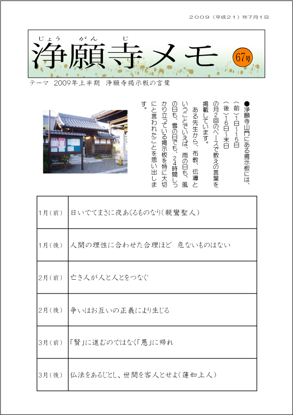 ●テーマ 2009年上半期 浄願寺掲示板の言葉(67号)