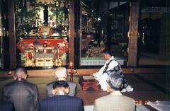 午前六時からの晨朝の後、澤面章氏(当寺前住職)の御文の拝読、越本達了さん(大阪 専光寺住職)の前座法話、黒田進先生(宮司町 満立寺住職)の法話です。