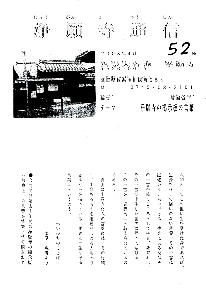 ●今号では過去十年間の浄願寺の掲示板(写真上)の言葉を特集させて頂きます。
