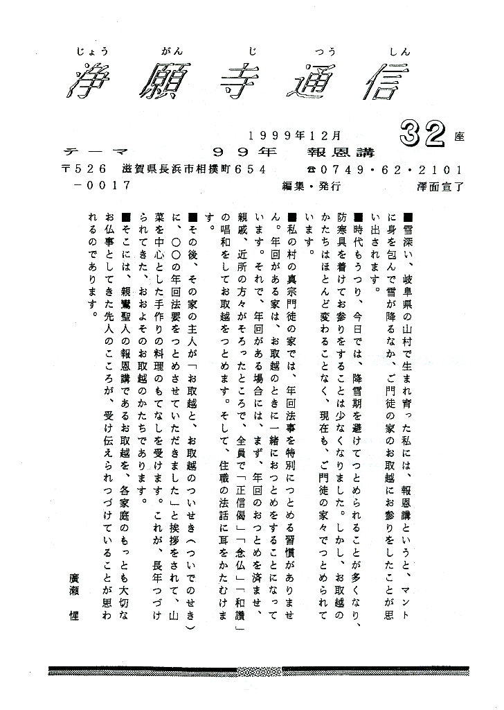 一九九九年も報恩講の御縁に遇わせて頂きました。準備から多様なお世話をして下さいました総代さん方、婦人会の方、そして皆さん方、有り難うございました。