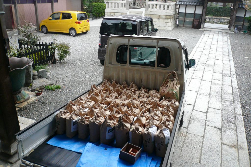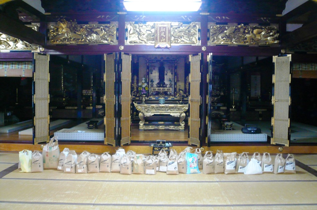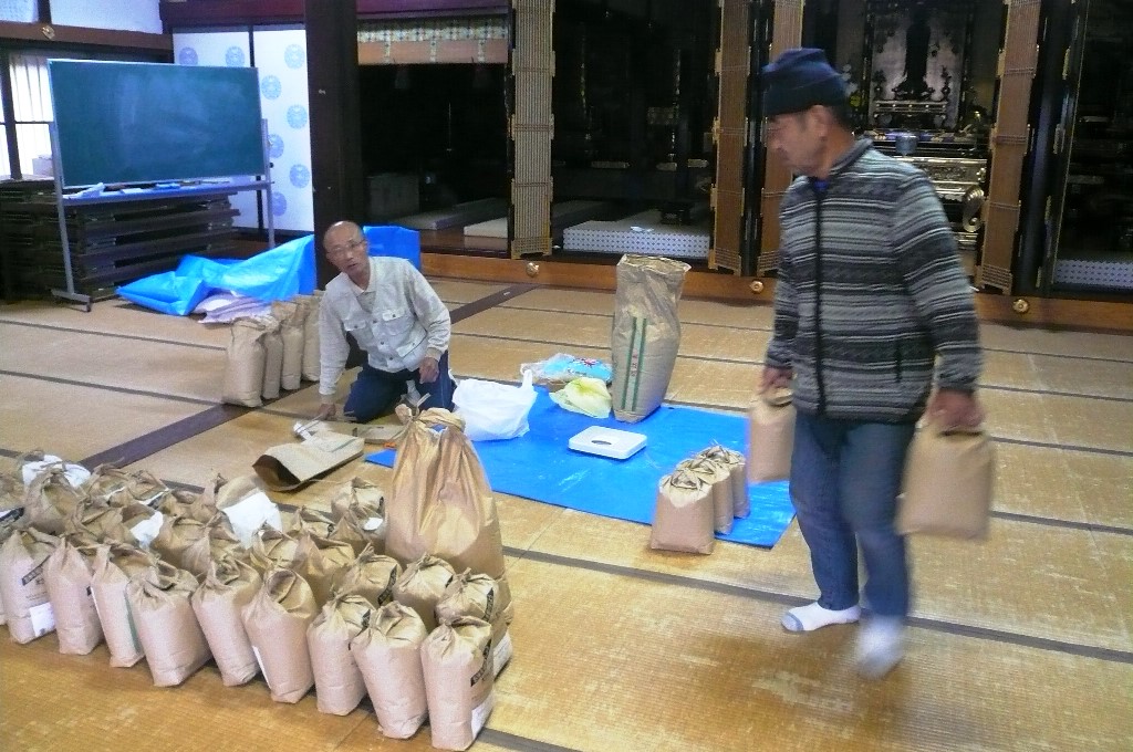 ▲第3回長浜教区発被災地への支援物資のお届けに対し、10月31日、浄願寺から長浜教区へ5キロの米袋63袋(群生会様12袋含む)のお米をお届け致しました。ご協力いただきましたご門徒さま、皆さま、誠にありがとうございました。その後、11月12日〜14日、長浜教区から5キロの米袋1502袋(集計7、8トン)のお米が被災地の方々に手渡されました。