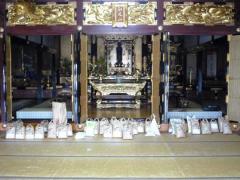 ▲集まったお米と飲料水は浄願寺本堂にお供えします。2012(平成24)年3月19日