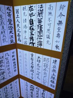 ▼お待ち受け事業である、手作り屏風に短冊(ご門徒様各戸で正信偈1行記述)を張り付ける」事業が今年の報恩講で公表(お披露目)されました。)(他所門徒様10戸含む)