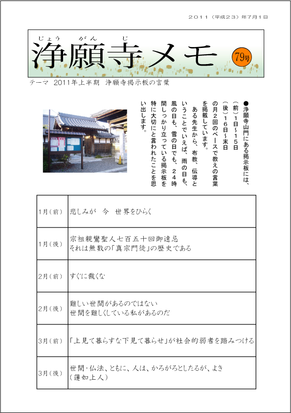 ●79号では、2010年1月〜6月までの浄願寺掲示板の言葉を掲載しました。