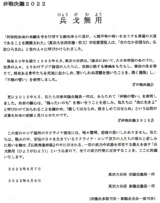 資料4 非戦決議2022 兵戈無用(ひょうがむよう)
