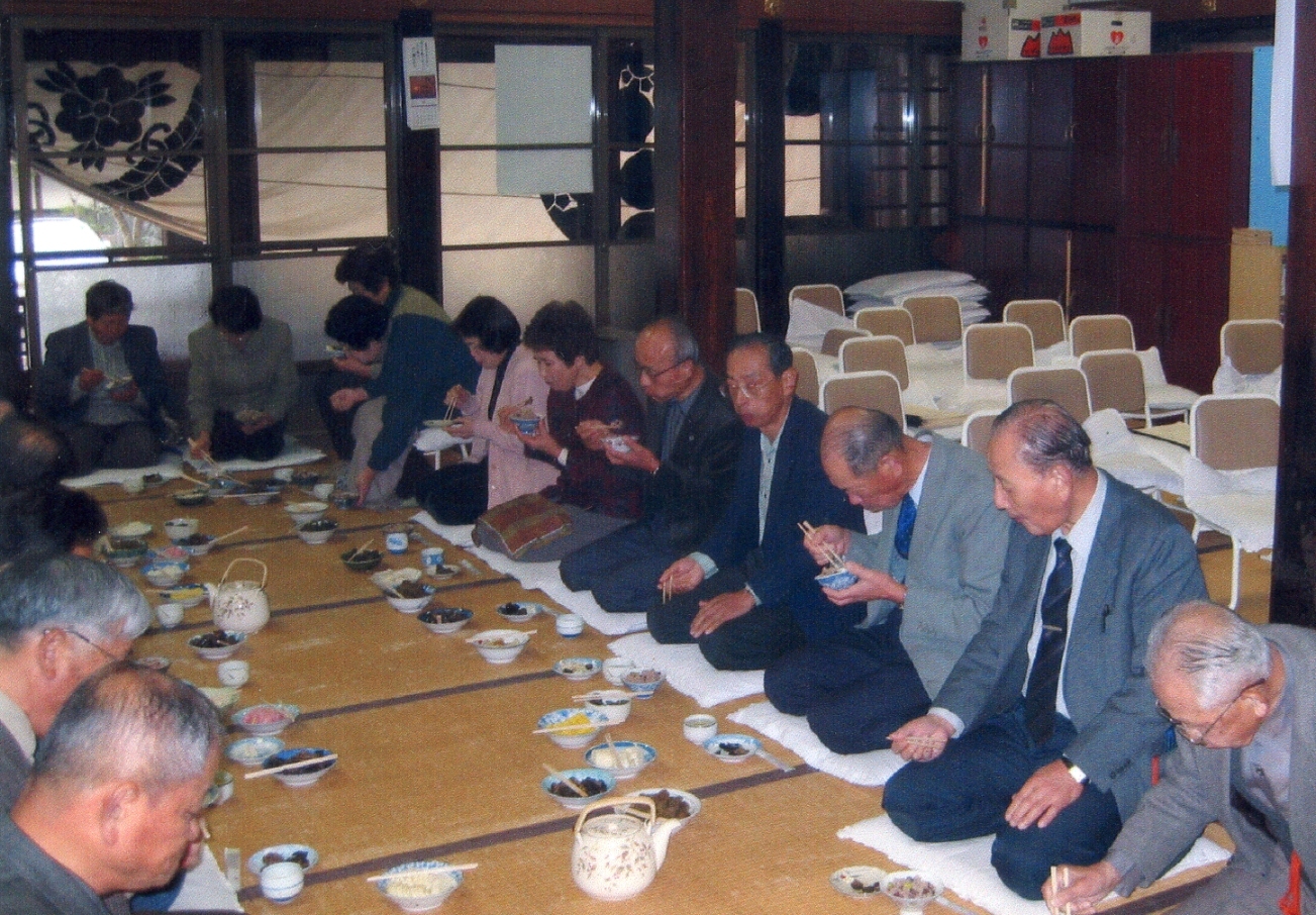↑法話の後、本堂であずきがゆをいただきました。