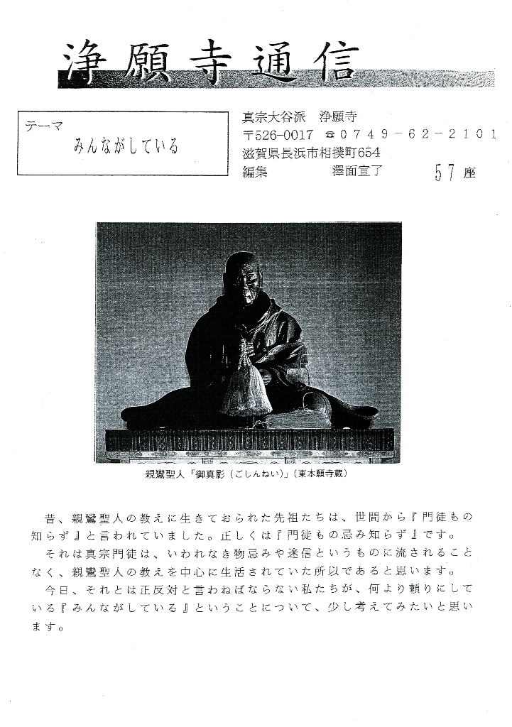 真宗門徒と呼ばれた人たちは、決して、『みんながしている』ということで、生活されていたのではないようです。(表紙参照)その姿は、誰の言うことも聞かず、ただ独断でということではなく、真宗の教えにいつも照らされながら、自分を生きておられたのだと思います。