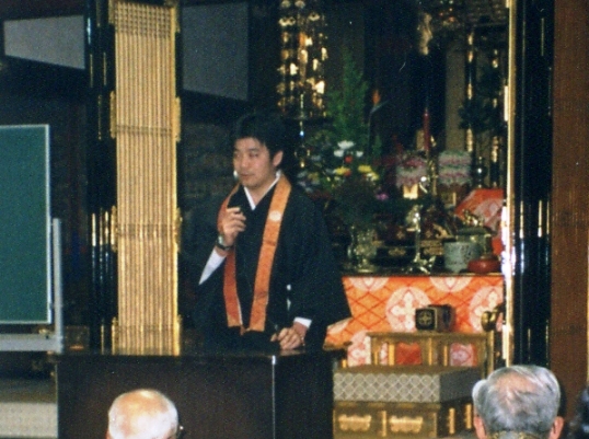 午前九時半からの満日中の後、島野政友さん(大阪 貞正寺住職)の御俗姓の拝読、高山崇さん(山階町 円乗寺住職)の前座法話、ユ ヨンジャさんの挨拶、黒田進先生の法話です。