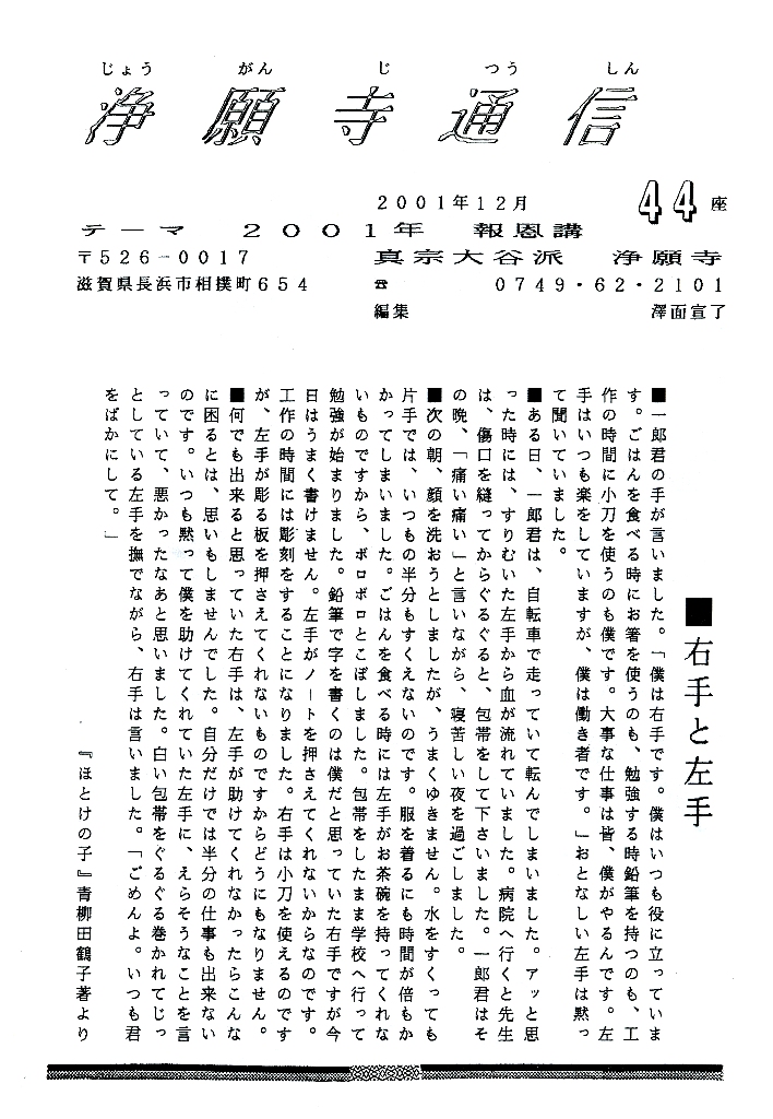 こうして、二〇〇一年も報恩講に遇わさせて頂きました。準備から多様なお世話と今回、写真撮影やわたがし作りまでして下さいました総代の皆様、婦人会の皆様、子ども会の役員の皆様、子ども報恩講に際して、お菓子を下さいました藤居吉男様、そして皆々様、ありがとうこざいました。