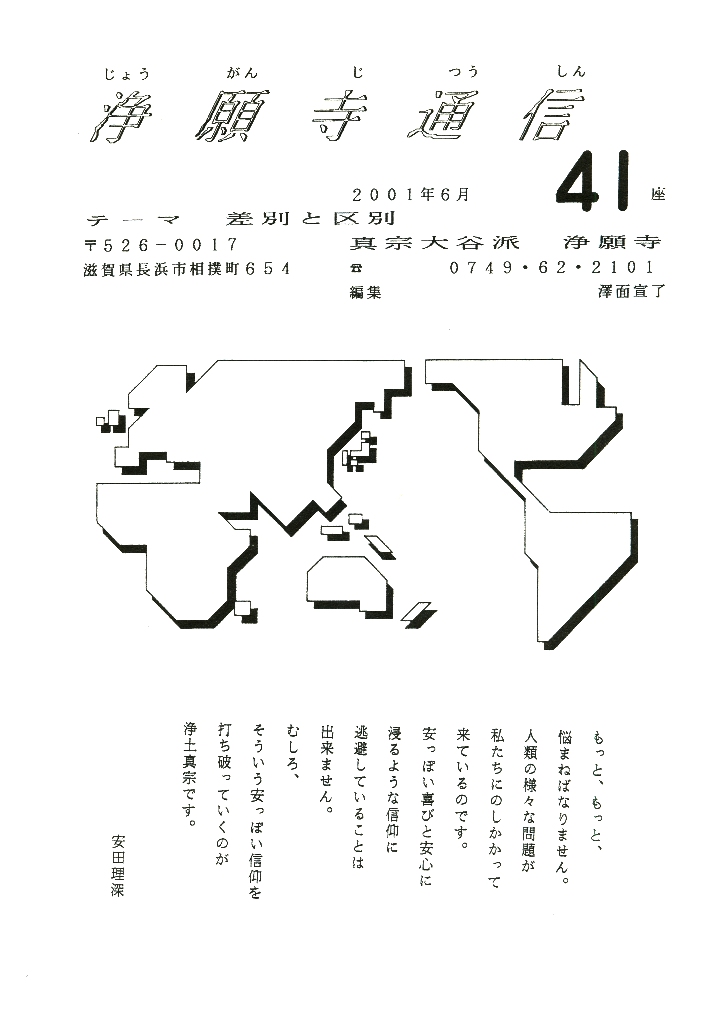 ▼私自身、人間が人間であるためにそんな差別の社会を温存している自らの在り方に深く、悲しみを持って歩み出すのか、それとも、開き直るのか、今、親鸞聖人から、そして、表紙の言葉からも厳しく問われていると思います。