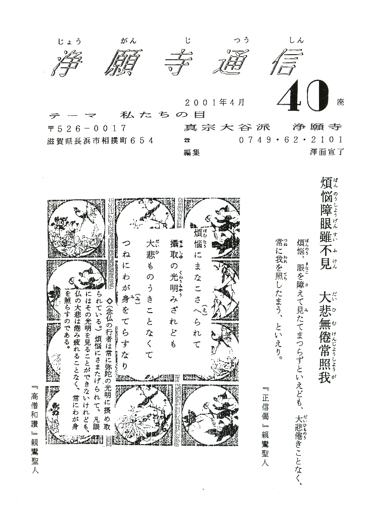 煩悩、眼(まなこ)を障(さ)えて見たてまつらずといえども、大悲倦(ものう)きことなく、常に我を照したまう、といえり。