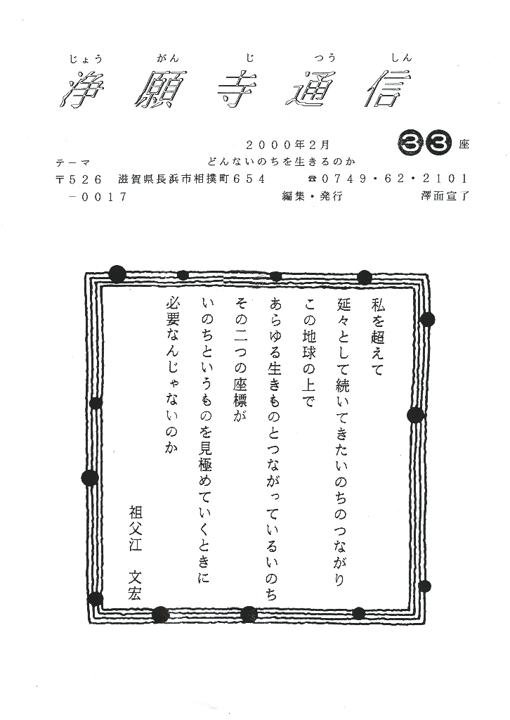 ■今まで私は、いのちというのは「私のいのち」とか「あなたのいのち」と表現するように極めて個人的なものに留めていました。こんな永劫な時間と広大な空間にひろがるいのちの世界があるなんて思ってもみませんでした。それは宮城先生や表紙の言葉等、「教え」というものに触れない限り、決して私の中から生まれてくる感覚ではありません。