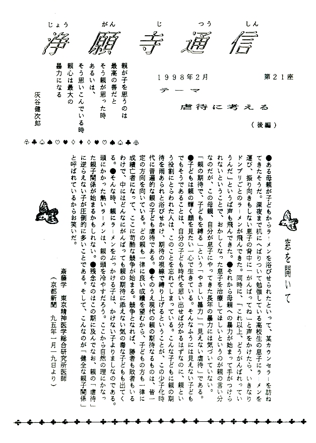 ◆人は誰もが虐待を生む心で生きている、そして、それはいつも、より弱い者に向かう…。虐待は一つの社会問題ではなく、一人ひとりの問題として、考えていかなければいけない。あらためて、20座の表紙の言葉が思い出されます。