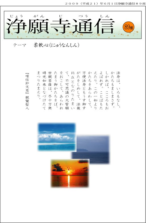 ■また、「やわらかなるは、水なり」とありますが、やはりその心は水に例えられます。水というのは、形も味も色もありません。形はコップであれ、花瓶であれ、その器の形に応じます。味も、お茶、コーヒー、お酒など、水がそのものの味を引き出すから美味しいのであり、水自体の味は主張しません。もし、主張すればその途端に美味しさは失われます。そして、色もまたそうであり、表紙の写真の海の如くに、青色、灰色、赤色と映し出します。