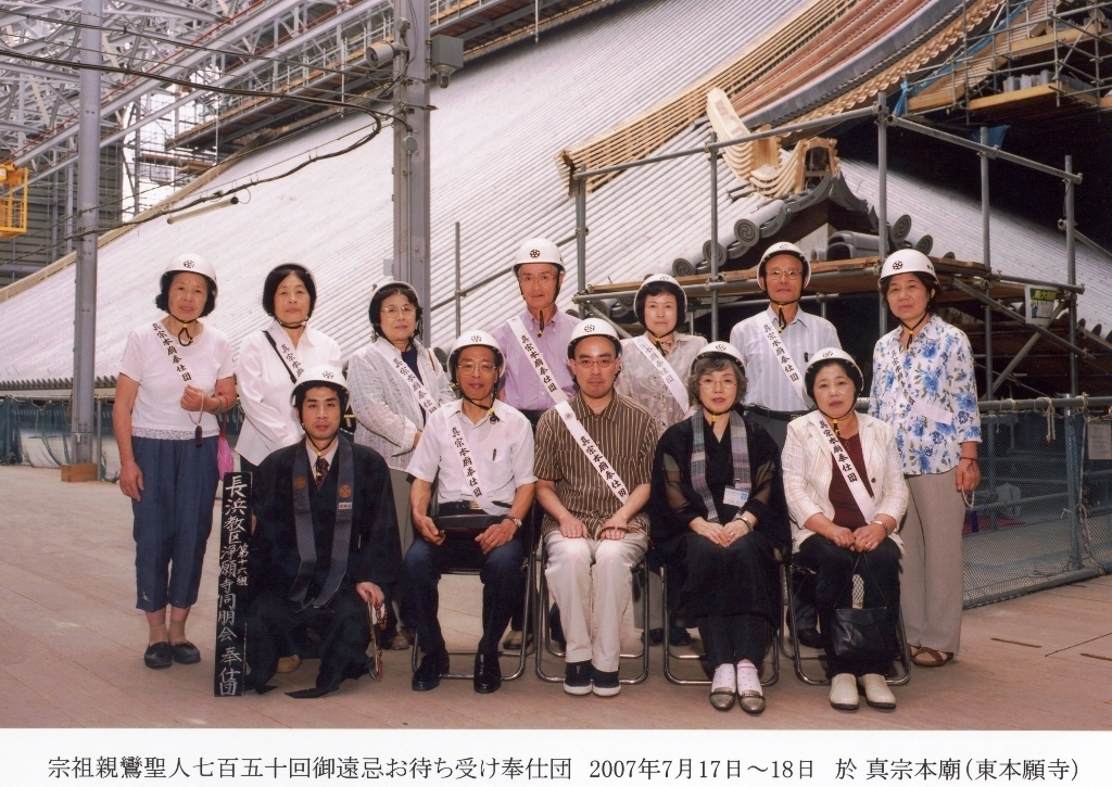 毎月二十八日に開催されております浄願寺同朋会で、住職様から「研修旅行も良いけれど親鸞聖人の七百五十回御遠忌(平成二十三年)お待ち受け事業の一環として、一度、真宗本廟(東本願寺)上山奉仕に参加させて頂いてはどうでしょうか?!」と云うお言葉を頂きまして、早速、皆様にお取り計いさせて頂きました処、まだ梅雨空が続く七月十七日から十八日に一泊二日で、浄願寺門徒会の同朋会で、十名の方が御縁を頂きました。既に、上山奉仕については、十六組を始め、他の団体等のお誘いで幾度も参加されている方もありますが、浄願寺同朋会主催としては初めての試みで、不安と楽しみを共感していました。