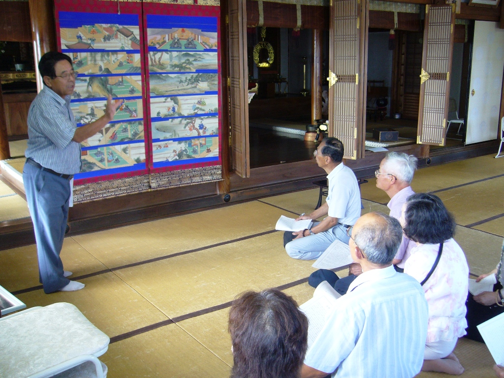 写真6 ↑易行寺住職さんには御木像の由来と住蓮房安楽房の御絵伝の絵解き等、お話をしていただきました。
