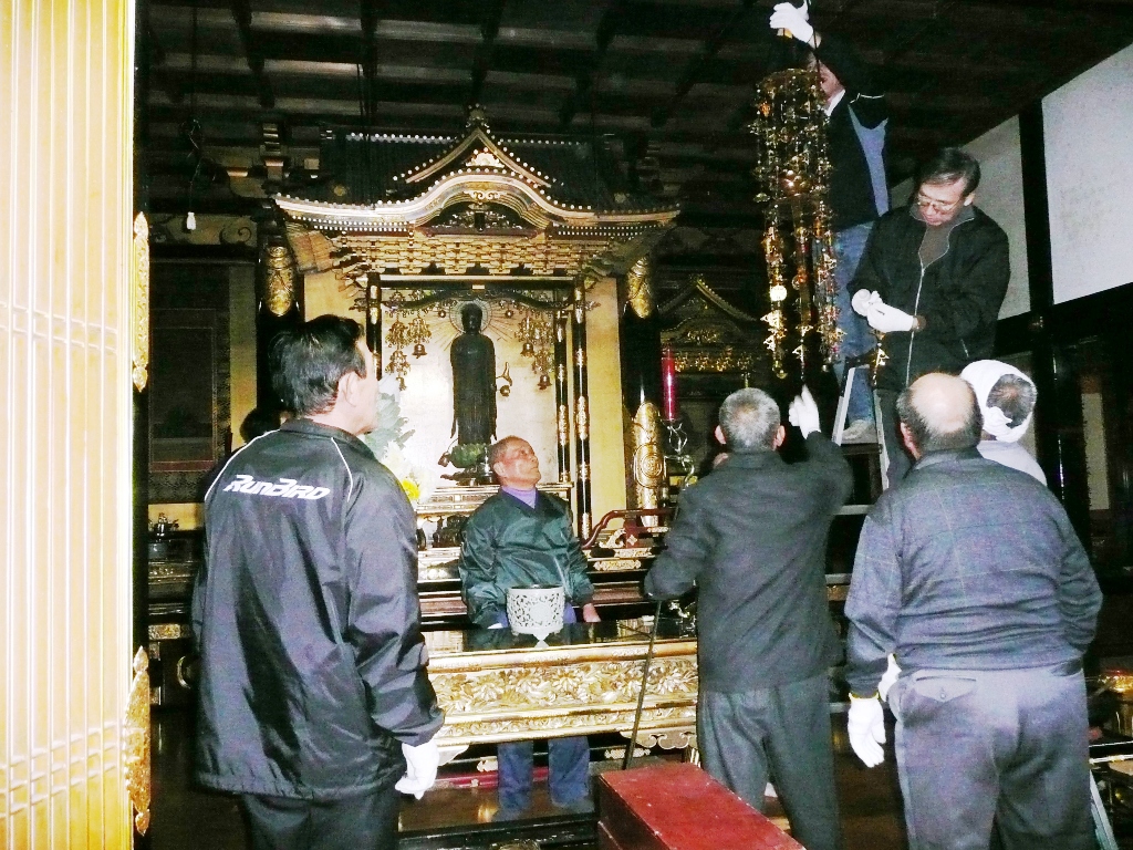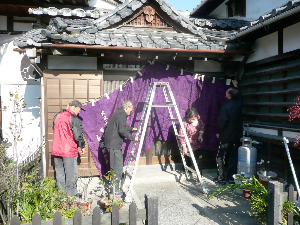 ↑11月30日(金)朝 山門 提灯設置 幕張り