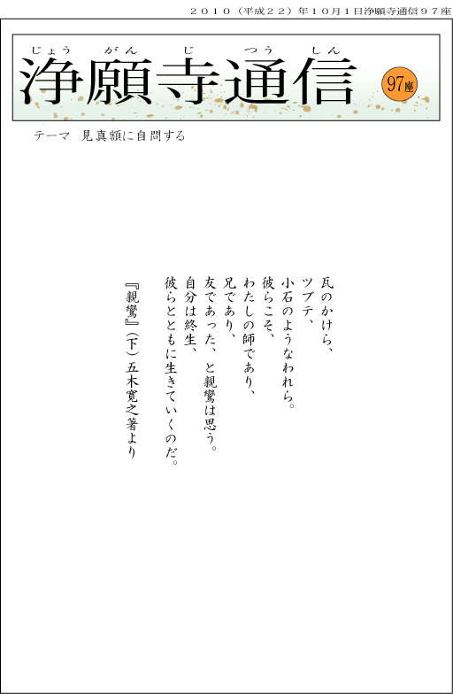 ■当時の権力者から流罪された親鸞聖人。また、社会から虐げられてきた「いし・かわら・つぶてのごとくなる」人を「われら」と仰った親鸞聖人(表紙参照)。そんな宗祖に、どこまでも背く私たちの体質を、この御遠忌を迎えるにあたって、まず、自問すべきです。