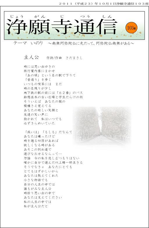 ▼表紙の歌は昭和53年に発表されたもので、当時の私は中学生でしたが、この歌にとても感動したことを今も憶えています。「あそこの別れ道で選びなおせるならって…」の詩が年々響いてきます。一度きりの人生、代わることの出来ない人生、「誰もがみな主人公」なんですね。カラオケでも時々歌っていますので、ぜひまた、リクエストくださいませ。(笑)