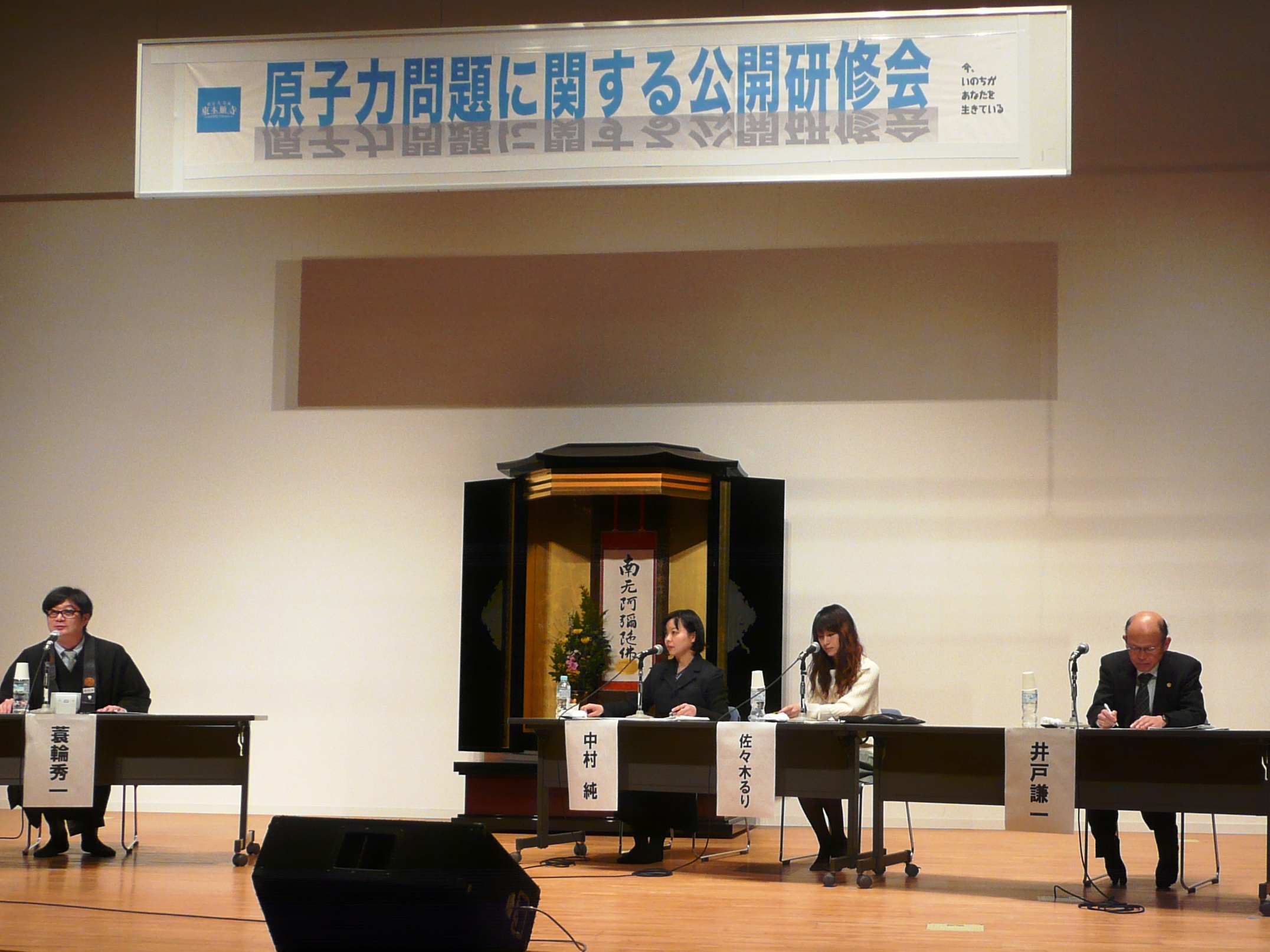 ■去る1月31日、東本願寺(真宗本廟)視聴覚ホールでの「第6回原子力問題に関するする公開研修会」 (下写真) に参加しました。そこで、弁護士である井戸謙一さんと福島県内や、関西に自主避難(疎開)し、子育てをされている保護者の佐々木るりさん、中村純さんのお話を聞かせていただきました。現場に身を置く方の、声をつまらせ涙ながらに語られるその言葉に、ただこの社会と自分自身が問われるばかりでした。当日、用意してくださいました、お二人の文章の一部をここに掲載させていただきます。
