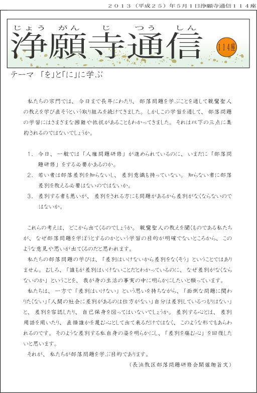 ▼藤場俊基先生のお話から、住職記にも、「根本に据えるべきことは、やはり「に」である」と書かせていただきました。そのことからひとつ思うことがあります。それは、表紙の趣旨文の1行目〜2行目の「部落問題を学ぶことを通して親鸞聖人の教えを学び直そう」は「部落問題を学ぶことを通して親鸞聖人の教えに学び直そう」とするのが適切ではないかと思います。また、話し合いの時間を持ちたいと思っています。