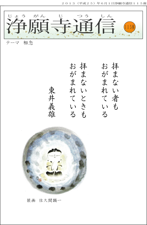 しかし、どうかするとこのこともまた、人間の行(ぎょう)と考えてしまいます。それは相手のことを人として大切に敬う…そう心がけるこちらからの話です。勿論それはとても大切なことです。しかしそんなことが果たして成り立つのでしょうか。住職記の中の親鸞聖人の言葉の如く、人間の私たちからはやはり地獄しか生み出しません。そうではなく、やはり表紙の東井義雄先生の言葉です。