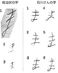 2、上申書には、第三筆終筆部の回転部に誤りのある「ま」が三例ある(3と5と6)。当時の石川さんがひらがなすら完全に習得していなかったことをあらわしている。
