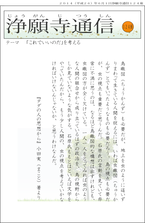 ▼鳥瞰図と虫瞰図の言葉は、折にふれて宮城豈頁先生が紹介してくださったもので、今回その原文を掲載させていただきました。これは小田実氏と石原慎太郎氏との対談なのですが、石原慎太郎氏はこの後、「政治は四捨五入だ」とまで言っています。それは少数派は切り捨てるということです。人は偉くなるほど上へ登ってしまい、鳥瞰図の視点で一人を見失ってしまうのでしょうか…。