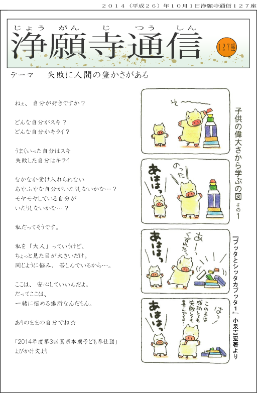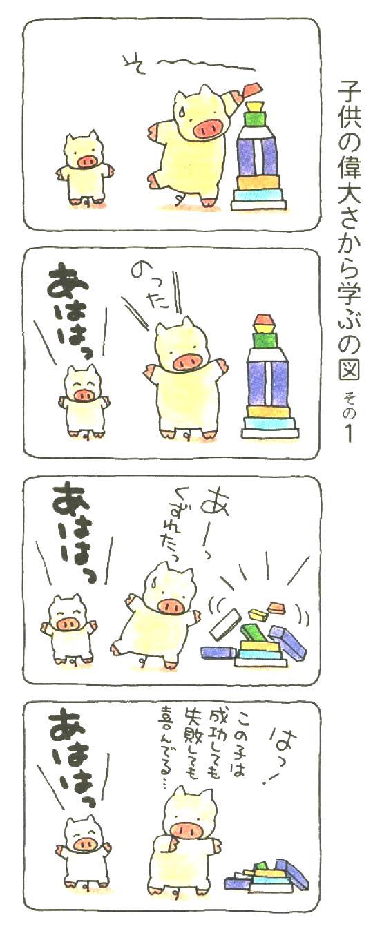 ■表紙のよびかけ文や漫画からも教えられることですが、うまくいったことも、失敗したこともどちらも喜ぶ幼児の時から、だんだんと分別がつき、それによってあらゆる機械を発明する大人が失敗を許さない世の中を作り出すのです。そしてそれによって自らも同じように悩み、苦しんでいるのです。