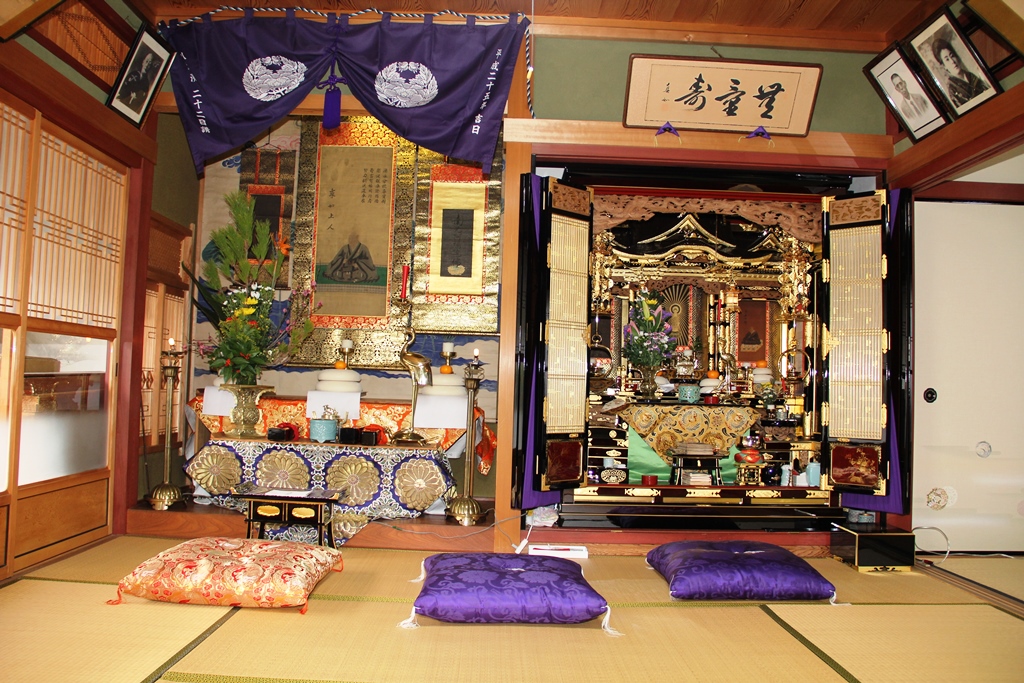 ↑お内仏(仏壇)の横、床の間に右から、南無阿弥陀仏、乗如上人、教如上人の御影