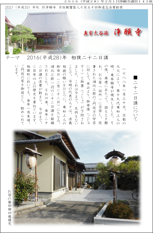 こうして、湖北二市二郡全ての御門徒が二十二日講の御縁にお遇いすることが出来るようになっています。今日、私たちはこの勝縁に遇い、乗如上人の御苦労、我がご先祖のご苦労と喜びの姿を偲びつつ、更に二百有余年連綿と伝えられてきた法悦の歴史を感じて、掌を合わす我が身の誇りと幸せを噛みしめたいものであります。