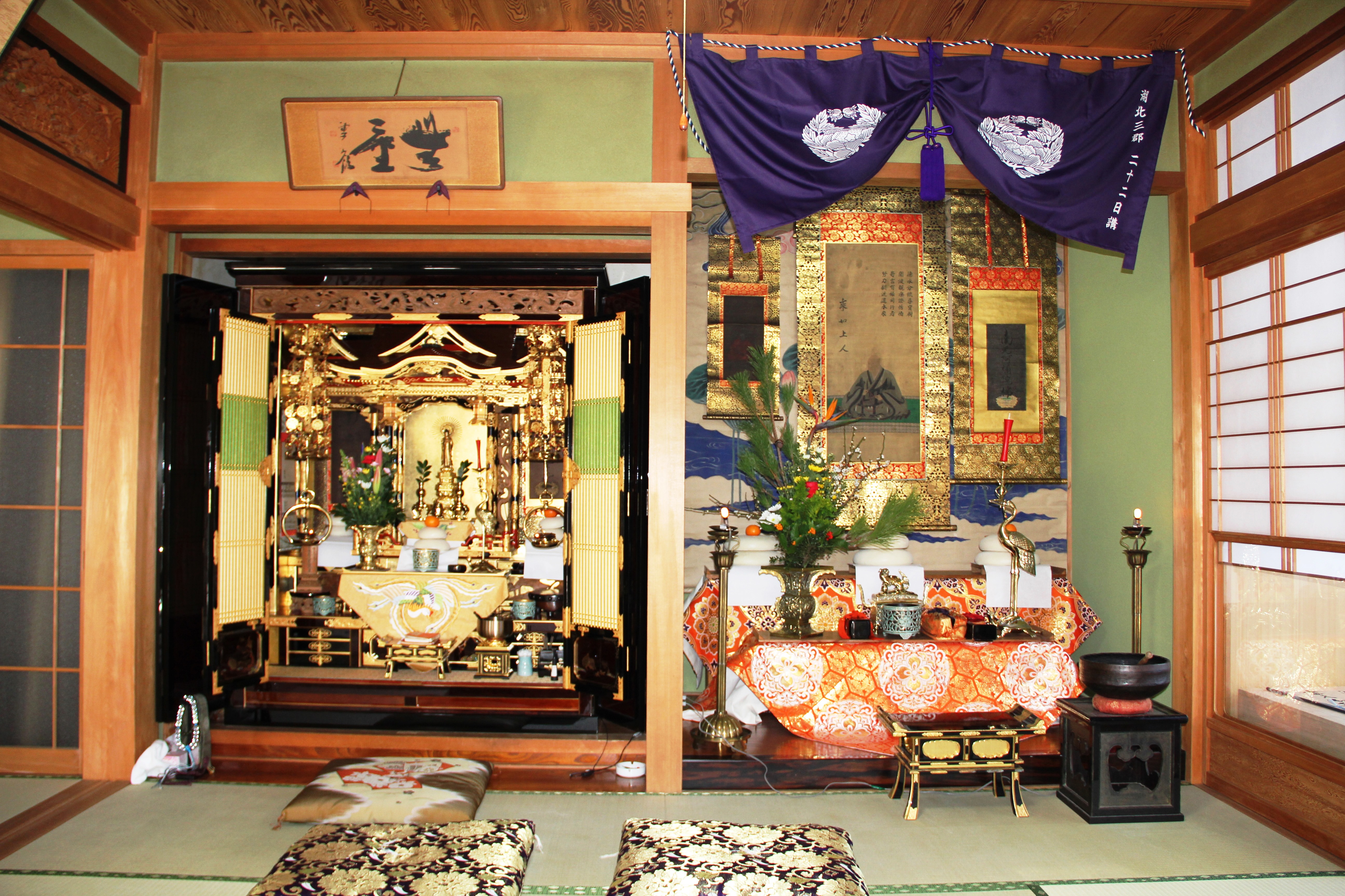 ↑お内仏(仏壇)の横、床の間に右から、南無阿弥陀仏、乗如上人、教如上人の御影
