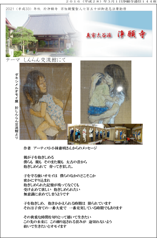▼2月8日、しんらん交流館にて、「ナムナム大集会9」と「ダキシメルオモイ展」というご縁をいただきました。「ダキシメルオモイ展」は以前から名古屋別院等、各地で開かれてあり、私もぜひ見せてもらいたいと思っていたので、今回実現したことはとても嬉しく思います。その絵の数々を見て、長浜別院で語ってくださった祖父江文宏さんのお話を思い出しました。次のような内容です。