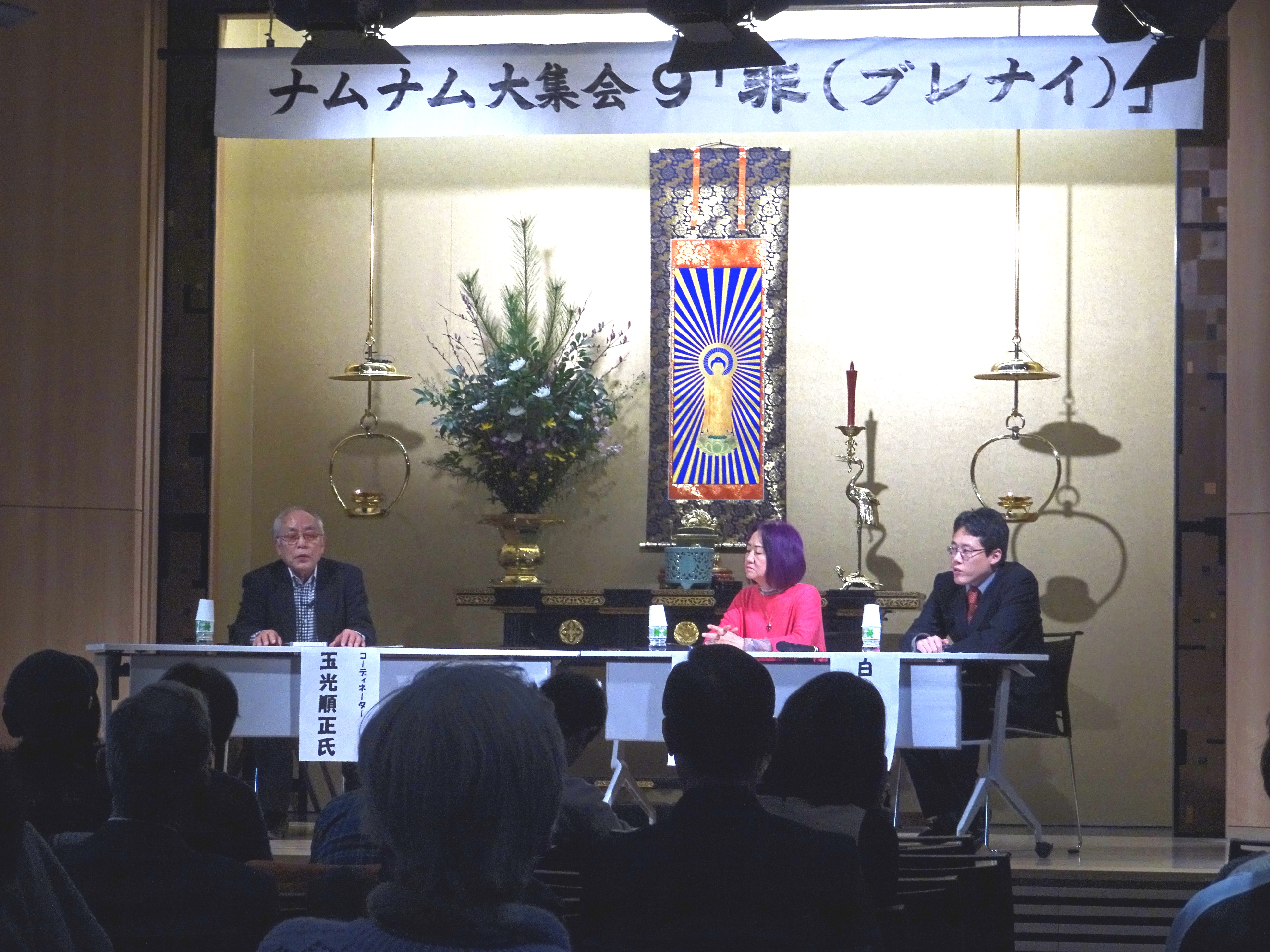 ●ナムナム大集会」とは、真宗大谷派僧侶を中心に、多方面で活動される方々に呼びかけた集まりで、宗祖親鸞の生涯をかけた歩みにおいて見出された真実、願いに気持ちを寄せる有志が企画・実行している集会です。●時の権力者、後鳥羽上皇による親鸞流罪から800年の2007年2月9日、東本願寺での法要と講演・シンポジウムを第1回として行い、以来、8回の大集会と2回の臨時集会(裁判員制度が施行された2009年5月と、東日本大震災直後の2011年5月)を継続してまいりました●今回、テーマを「非(ブレナイ)」〜どんなことがあっても、多数の権力の側に加わらず、“ひとり”独立者として自分で考え歩んていく〜として、「ナムナム大集会9」を開催いたします。●親鸞は流罪以後、自身を非僧非俗と位置づけ、国家権力と対峙する姿勢を貫かれました。●歎異抄には「念仏は行者のために、非行非善なり」とあります。念仏がそれをする人にとって非行非善であるとは、念仏は、徹底してこの世とは迎合しないものてあることを示しておられます。●福島、沖縄の問題や安保法制の進め方に見える国家権力の思惑、メディアのあり方、何より、「さしあたっての無難」を求める私たちの持つ体質‥・。一人ひとりの身を離れることのない時代社会の問題に対しても、「一人が声を上げても仕方がない」「そういうものだろう」という意識に飼い慣らされてきた私たちは、一方で「何かが違う」、「このままではいけない」と気づき、変わり始める動きを感じています。●今回は、テーマを「非(ブレナイ)」〜どんなことがあっても、多数の権力の側に加わらず、“ひとり”独立者として自分で考え歩んていく〜として、「ナムナム大集会9」を開催いたします。●ゲストスピーカーに浜矩子さん、白井聡さんをお招きし、親鸞が歩み、私たちが課題とする「独立した人間として生きる」ということを、過去からの声を聞き、未来に生きる人々を思い、今、見るべきもの、聞くべきことをともに確かめてまいりたく存じます。