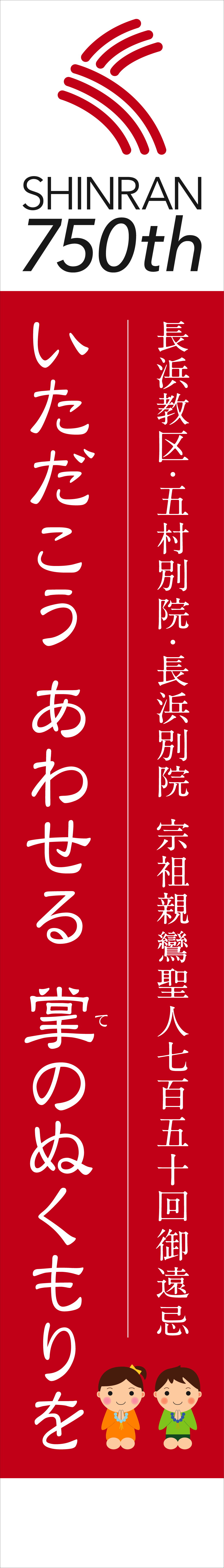 ★2019(平成31)年5月、長浜教区・五村別院・長浜別院 宗祖親鸞聖人七百五十回御遠忌に向けて「いただこう あわせる 掌のぬくもりを」のスローガンとキャラクター、そしてお寺の名前が書かれた懸垂幕が各寺院に配布されました。