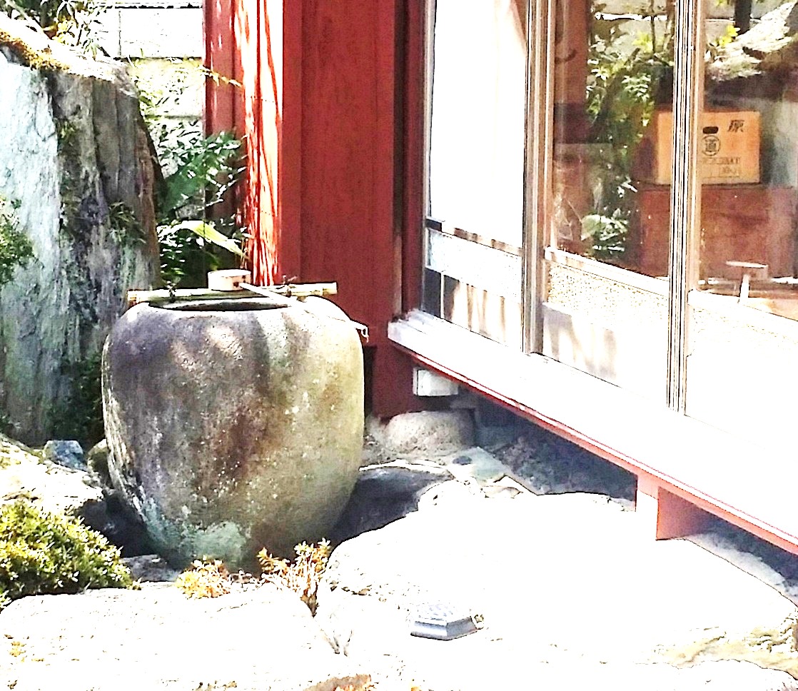 ■先ず執行する召請人の、「先請弥陀入道場」から始まり『正信偈』の「帰命無量寿如来」の後、「南無不可思議光」からは助音である和讃人と皆でお勤めするその源流がここに書かれている通りです。浄土真宗の儀式の源流です。この日だけは召請人もお経の玄関から入るのですが、その際、本来はお経の玄関の横に安置されている手水鉢(ちょうずばち)で身を清めてから、座敷に入ります。(写真下)