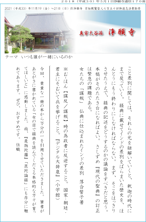 ▼4月8日の夕方から、身体が不調になり即入院になりました。ご心配をおかけ致しましたが20日に退院となりました。最初のことを思うと、たまたまこんなに回復し、皆々さまには本当にありがとうございました。頂いた身体、今後くれぐれも大切にさせて頂きます。尚、今回の浄願寺通信は不思議のご縁で病室で書かせて頂きました。合掌