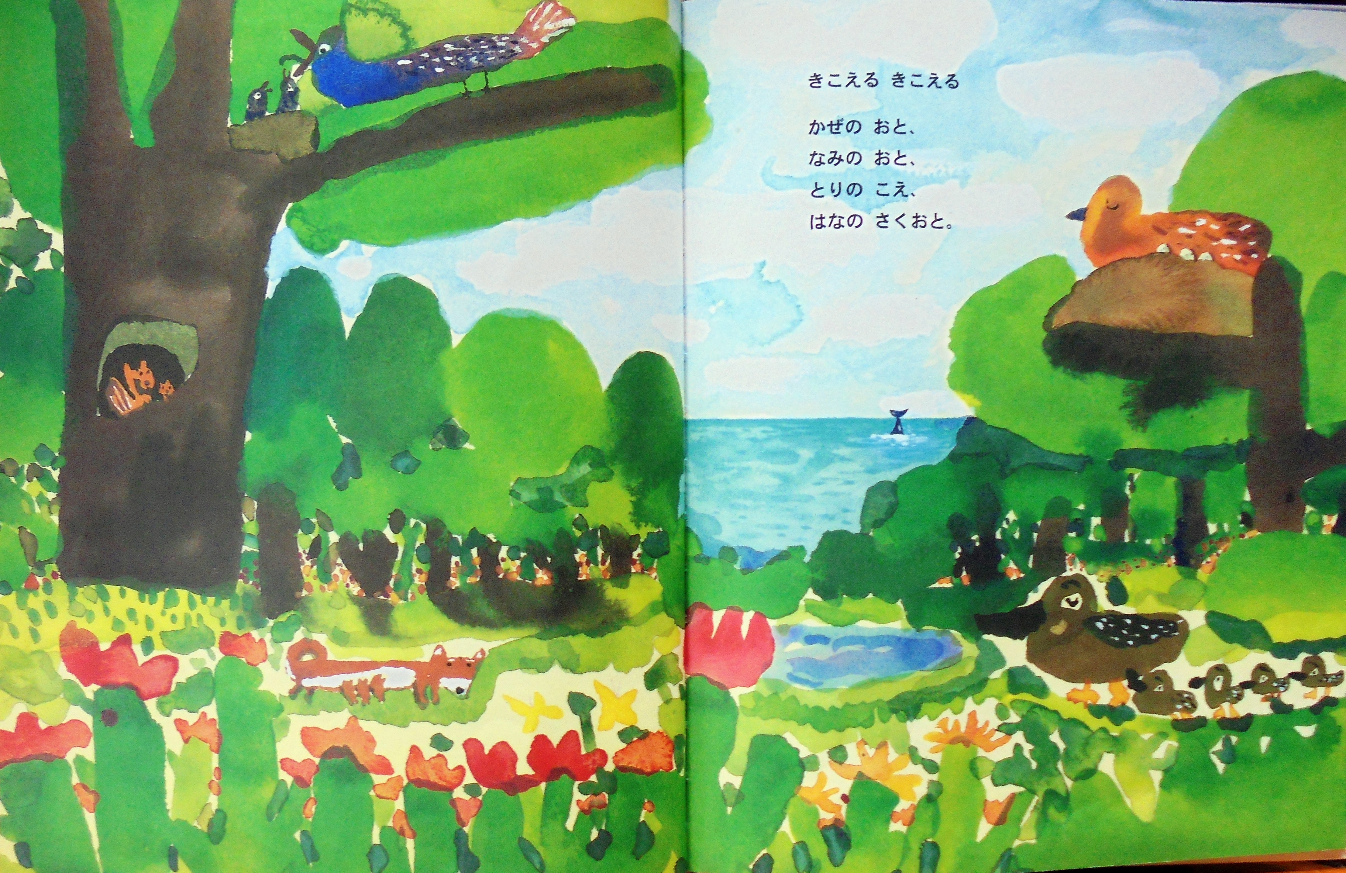 扱い込まれそうに青い空でした。「ぼくが生まれてくるとき、どんなだったの?」半身を起こしただいすけくんが、私の視界いっぱいに顔を近づけて言いました。「たいへんだったんだよ。みんな、大忙しだった」「大忙しだったの? ぽくのお父さんと、お母さん?」「君のお父さんとお母さんも大忙しだった。けれど、ほかのみんなが、もっと、もっと大忙しだったんだよ」「お父さんとお母さんだけとちがうの?」「君のお父さんとお母さんの大忙しは、みんなに頼んでまわることだったんだ」「頼んでまわったの?」「頼んでまわったさ。お父さんとお母さんのところに、赤ちゃんが生まれてきます。どうか、仲良ししてやってくださいって、みんなに頼んでまわったさ」「みんなに?」「みんなにさ。君より先に生まれていたみんなにだよ」「園長すけにも? 先生にも?さっちゃんにも、ひろくんにも?」「ああ、みんなにだ。人間だけとちがうのだよ。犬さんにも猫さんにも、雀さんにも、虫さんにも、草さんや木さんにもだ」「象さんにも?」「そうさ。キリンさんやカバさんやライオンさんにも頼んだのさ」「お魚さんにも?」「頼んださ。だいすけくんが赤ちゃんになって生まれてきます。どうか、仲良ししてやってください」「そうしたら?」「みんな、大忙しになった」「みんな、大忙しになったの?」「なった、なった。たいへんな大忙しだ。会議、会議、で大忙しだ」「会議、会議?」「そうさ。だって、だいすけくんがどんな赤ちゃんか解らないもん。やさしい子だったらいいけれど、先に生まれているものをいじめる子かもしれないもん。いじめられたらたいへんだ。だから、一生懸命の、大忙しの会議だった」「それでぼく、生まれたの?」「そうだ。みんなが、生まれてきていいよって言ってくれたんだ。この赤ちゃんは、やさしい子になってくれるだろう。生きているみんなを大切にする人間になってくれるだろう。みんな、そう思ったんだ。そう思ったから、パチパチって拍手したんだ。おめでとうって、言ったんだ」「良かった」だいすけくんは、頭の下に手を組んで半身を倒しました。コスモスの花が揺れ、蜂の羽音が聞こえました。