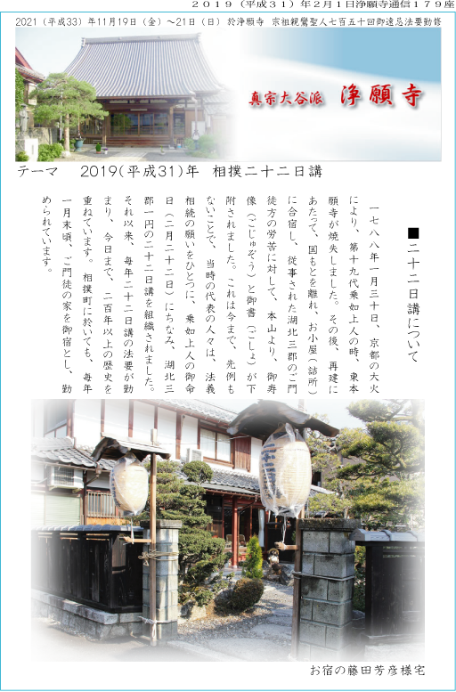 こうして、湖北二市二郡全ての御門徒が二十二日講の御縁にお遇いすることが出来るようになっています。今日、私たちはこの勝縁に遇い、乗如上人の御苦労、我がご先祖のご苦労と喜びの姿を偲びつつ、更に二百有余年連綿と伝えられてきた法悦の歴史を感じて、掌を合わす我が身の誇りと幸せを噛みしめたいものであります。