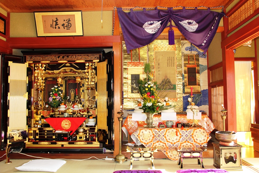 ↑お内仏(仏壇)の横、床の間に左から、南無阿弥陀仏、乗如上人、教如上人の御影