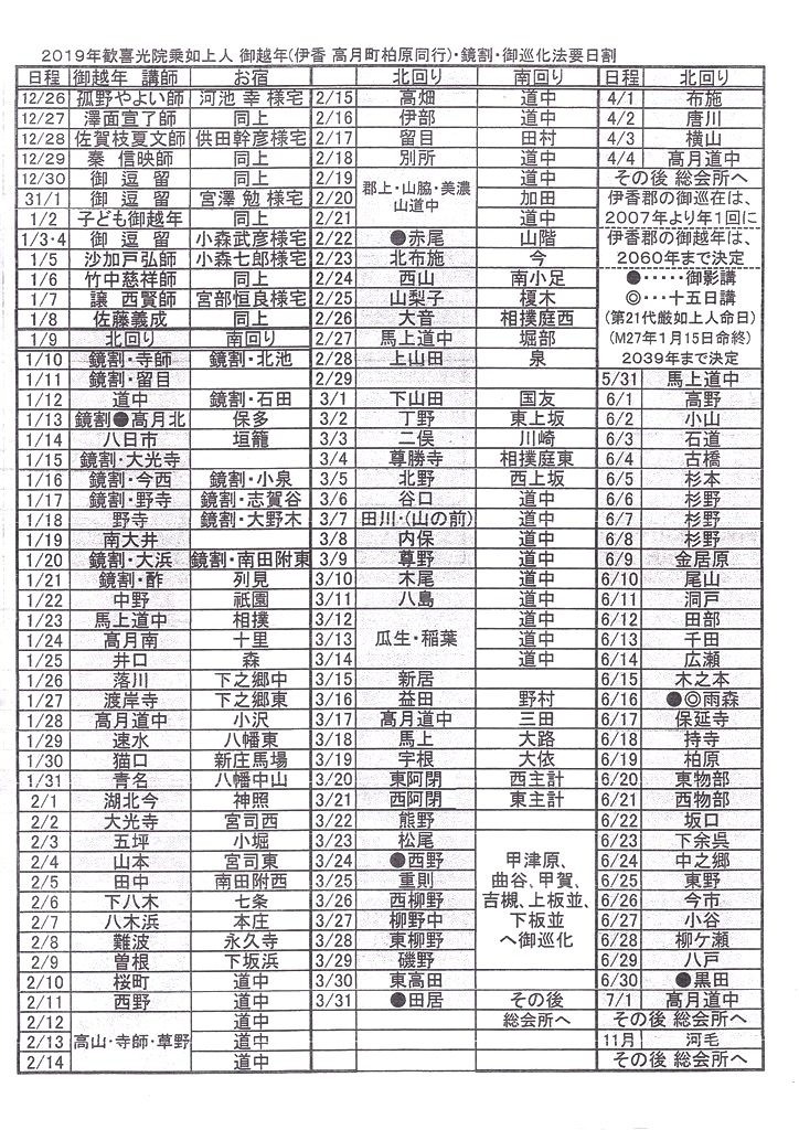 「御越年法要」はこの組織の一から六の順序でお勤まりになり、その後、一から三の組織で一幅の御影が、四から六の組織であと一幅の御影が御巡在になりますが、「鏡割りお講」は各組織のそれぞれ数カ所(概ね旧村落)で、営まれ、そのあと各集落への御巡在となる訳であります。