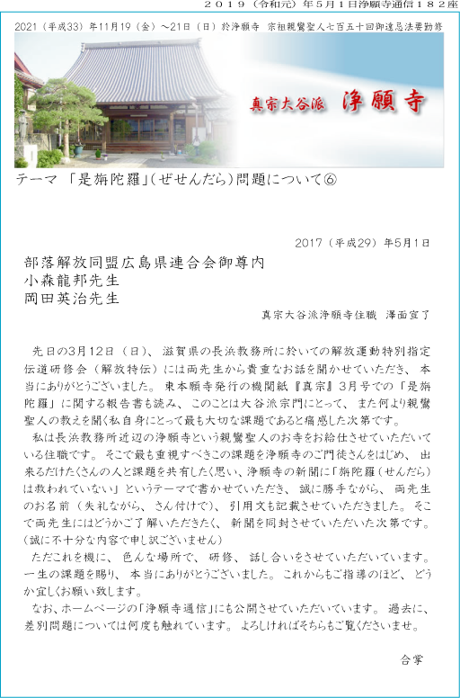 なお、ホームページの「浄願寺通信」にも公開させていただいています。過去に、差別問題については何度も触れています。よろしければそちらもご覧くださいませ。